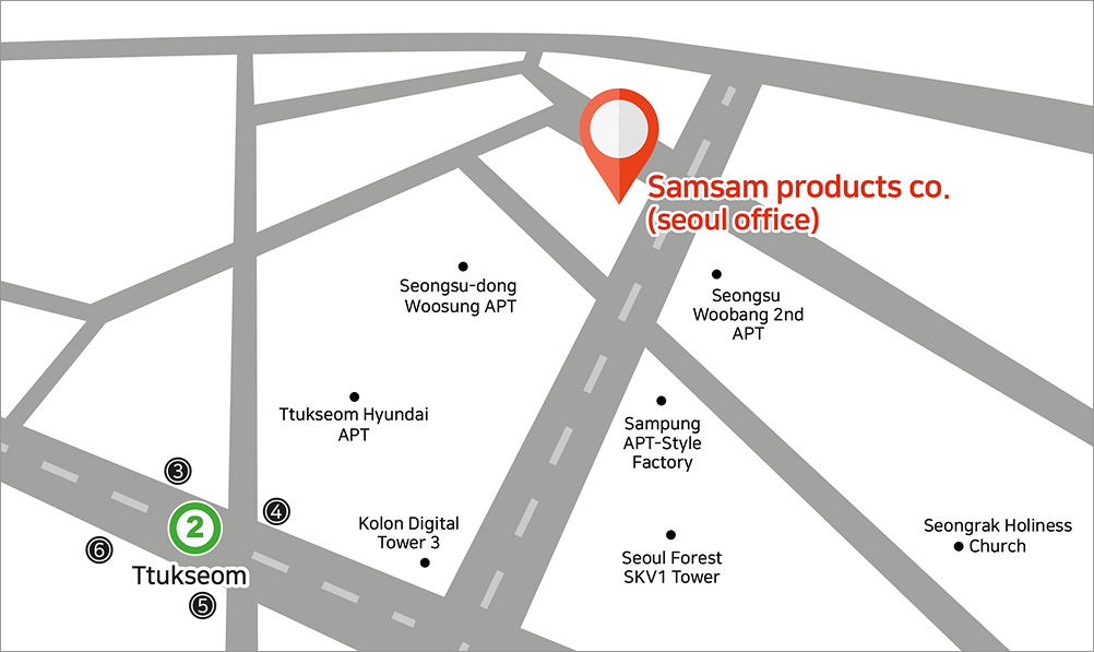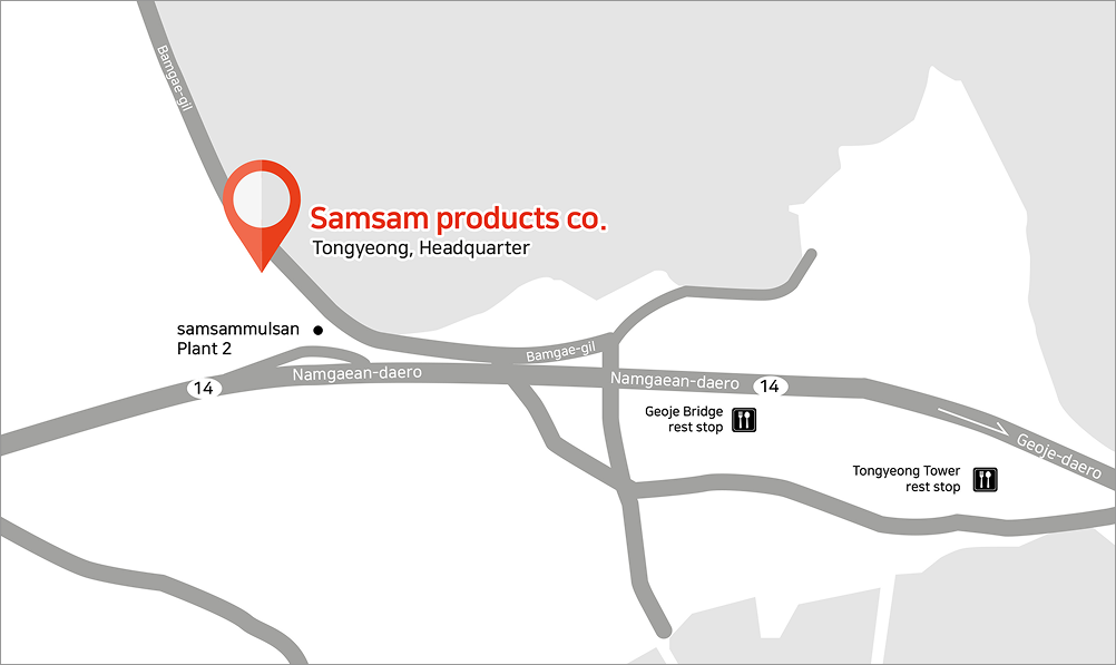 Samsam Products Co., Ltd.’s headquarter and manufacturing plant is located on the coast of Tongyeong-si, Namhae, Gyeongsangnam-do, where 570 small islands and natural scenery harmonize.